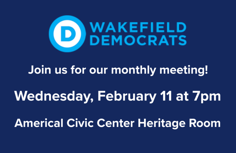 The next Wakefield Democratic Town Committee monthly meeting is this Wednesday, February 11 at 7PM. We will meet in the Heritage Room at the Americal Civic Center.